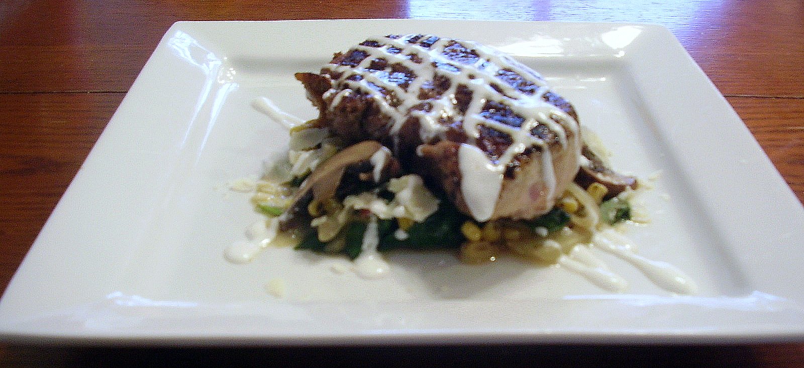 Grilled Jerk Seasoned Center Cut Pork Loin with Fresh Corn, Spinach, Wild Mushrooms and Garnished with a Creme Fraiche