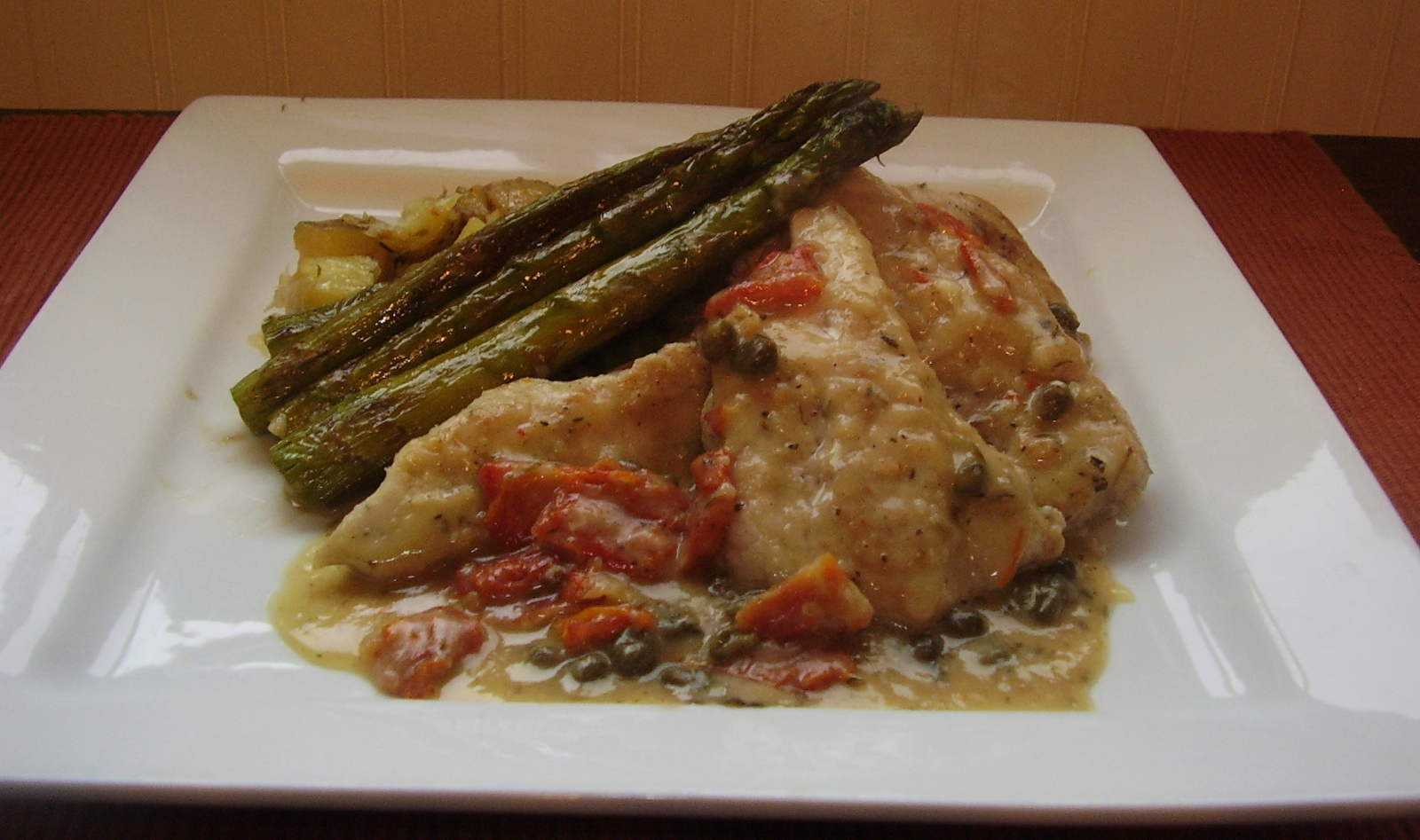 Pan Seared Pork Cutlets with a White Wine Lemon Caper Sauce and Grilled Asparagus Served with Roasted Yukon Potatoes
