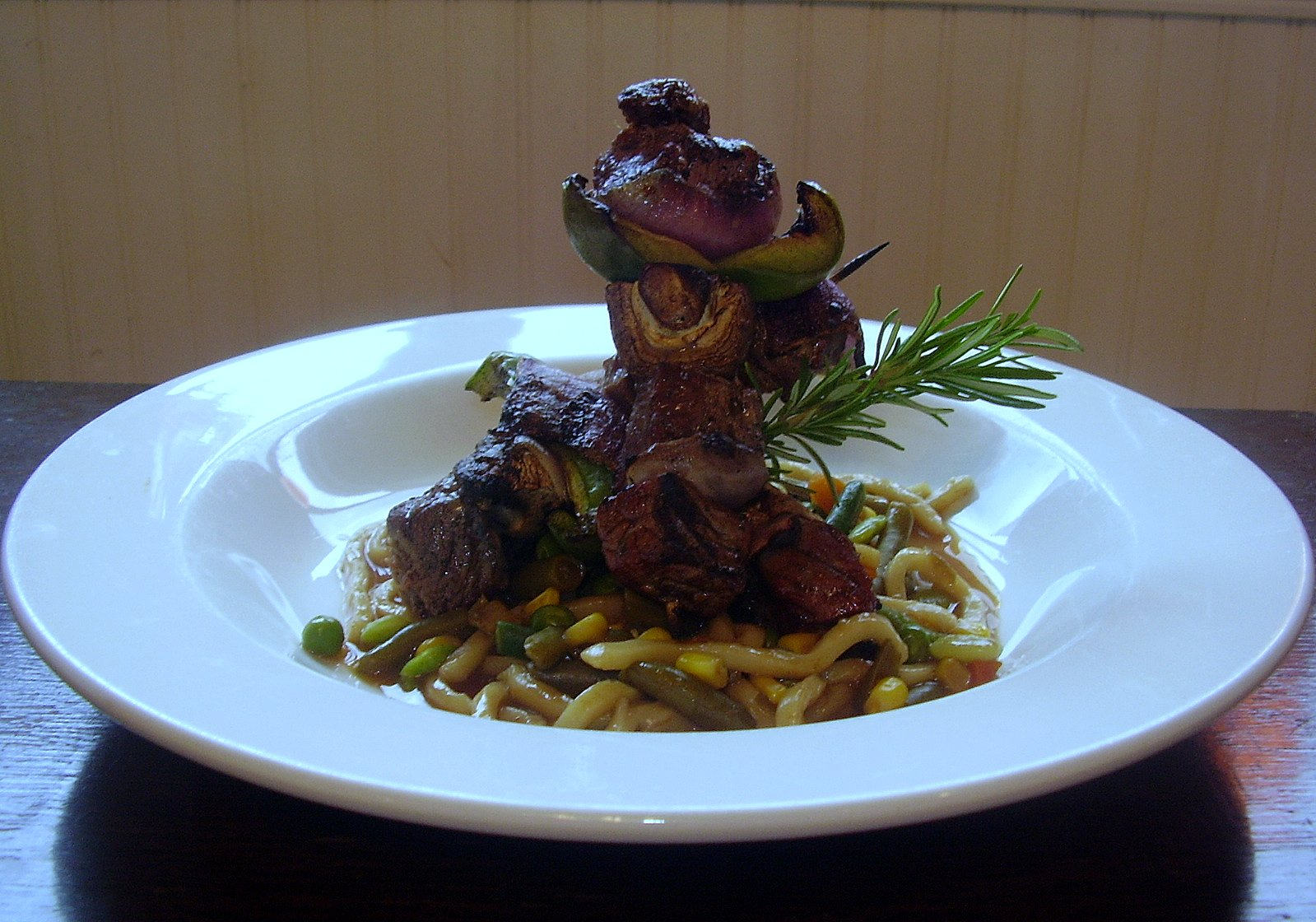 Grilled Teriyaki Beef and Vegetable Skewers with Udon Noodles Garnished with a Rosemary Sprig